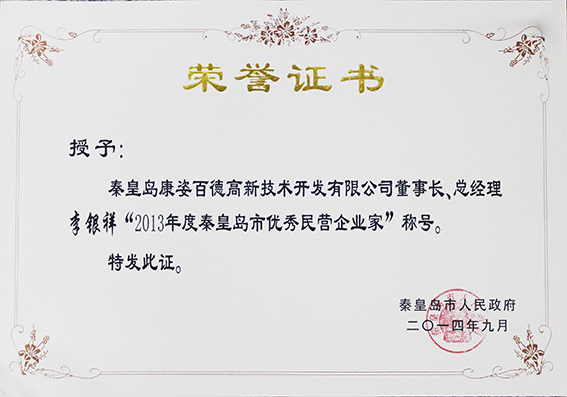 2019年6月李銀祥董事長榮獲2019年度“最美秦皇島人 最美民營企業(yè)家”個人榮譽(yù)稱號。
