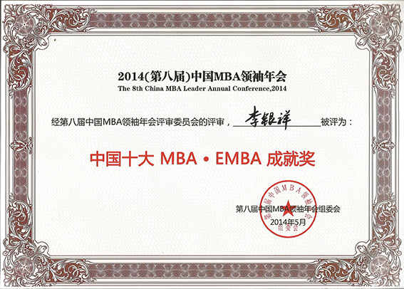 2014年5月4日,公司董事長李銀祥在2014(第八屆)中國MBA領(lǐng)袖年會上榮獲“中國十大MBA EMBA成就獎”。