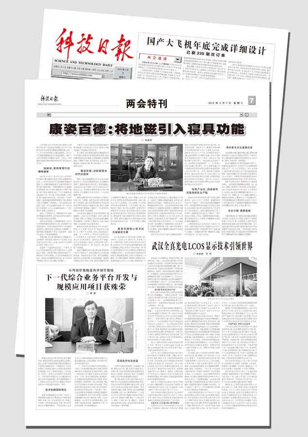 2012年3月7日,《科技日?qǐng)?bào)》兩會(huì)特刊對(duì)秦皇島康姿百德高新技術(shù)開(kāi)發(fā)有限公司進(jìn)行了大篇幅的專題報(bào)道。整篇報(bào)道立體地展現(xiàn)了康姿百德磁性功能寢具的獨(dú)特優(yōu)勢(shì),全面地回顧了康姿百德輝煌的發(fā)展歷程。