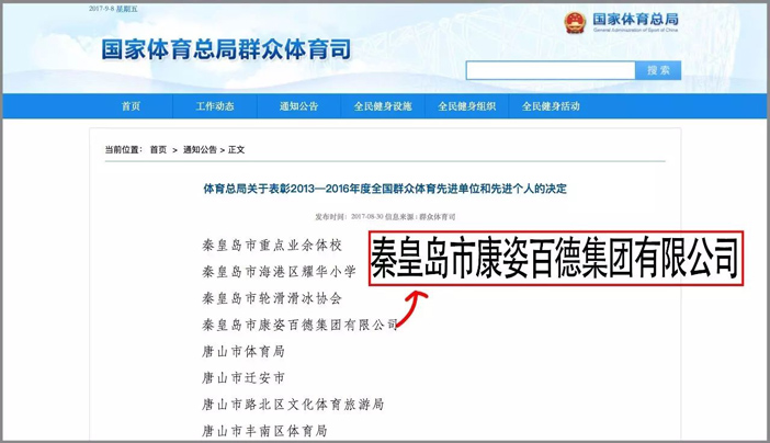 2017年,國(guó)家體育總局在全國(guó)范圍內(nèi)評(píng)選“2013~2016年度全國(guó)群眾體育先進(jìn)單位”,康姿百德集團(tuán)入選。