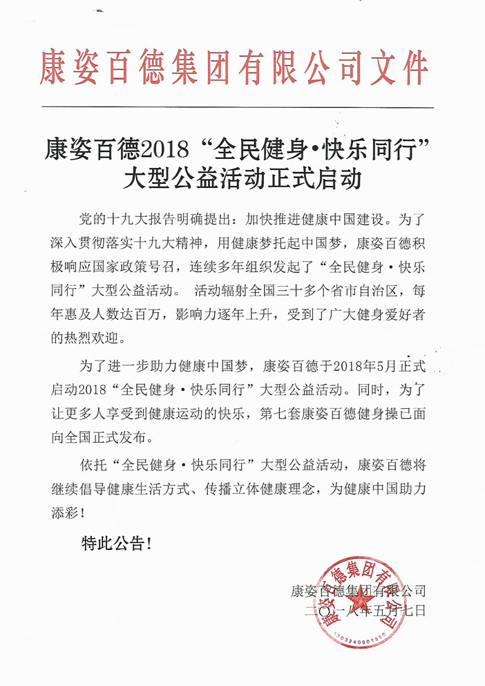 康姿百德2018“全民健身?快樂同行”大型公益活動(dòng)正式啟動(dòng),公告全文如下: