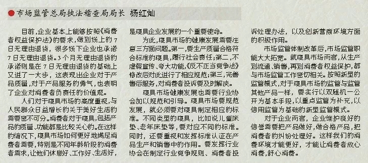 為此,寢具市場的健康發(fā)展需要注意三方面問題。第一,要生產(chǎn)質(zhì)量合格符合標準的寢具,履行社會責任;第二,不虛假宣傳、夸大功能,《反不正當競爭法》修改后對此進行了相應規(guī)范;第三,完善售后服務(wù),對消費者投訴要及時解決。