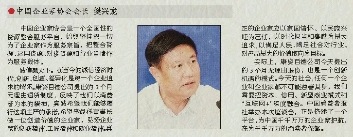 實際上,康姿百德公司今天提出的3個月無理由退貨,也是一個創(chuàng)新機遇的模式。今天的社會,任何一個企業(yè)和企業(yè)家都不可能獨善其身,我們需要把資本、信用、新型商業(yè)模式和“互聯(lián)網(wǎng)+”深度融合。中國消費者報社舉辦本次座談會,正是搭建了一個平臺,為中國千千萬萬的企業(yè)家護航,在為千千萬萬的消費者保駕。