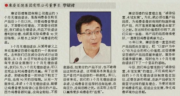 誠信贏天下。在當今的誠信經(jīng)濟時代,創(chuàng)新、創(chuàng)意、差異化是每一個企業(yè)追求的情懷??底税俚鹿咎岢龅?個月無理由退貨制度,反映了他們以消費者為本的精神,真誠希望他們能夠履行這項莊嚴的承諾,希望李銀祥董事長做一位創(chuàng)造價值的企業(yè)家,弘揚企業(yè)家的創(chuàng)新精神、工匠精神和敬業(yè)精神。真正的企業(yè)家應以家國情懷、以民族興旺為己任,以時代擔當和奉獻為最大追求,以滿足人民、滿足社會對行業(yè)、對產(chǎn)品最大的價值取向為目標。