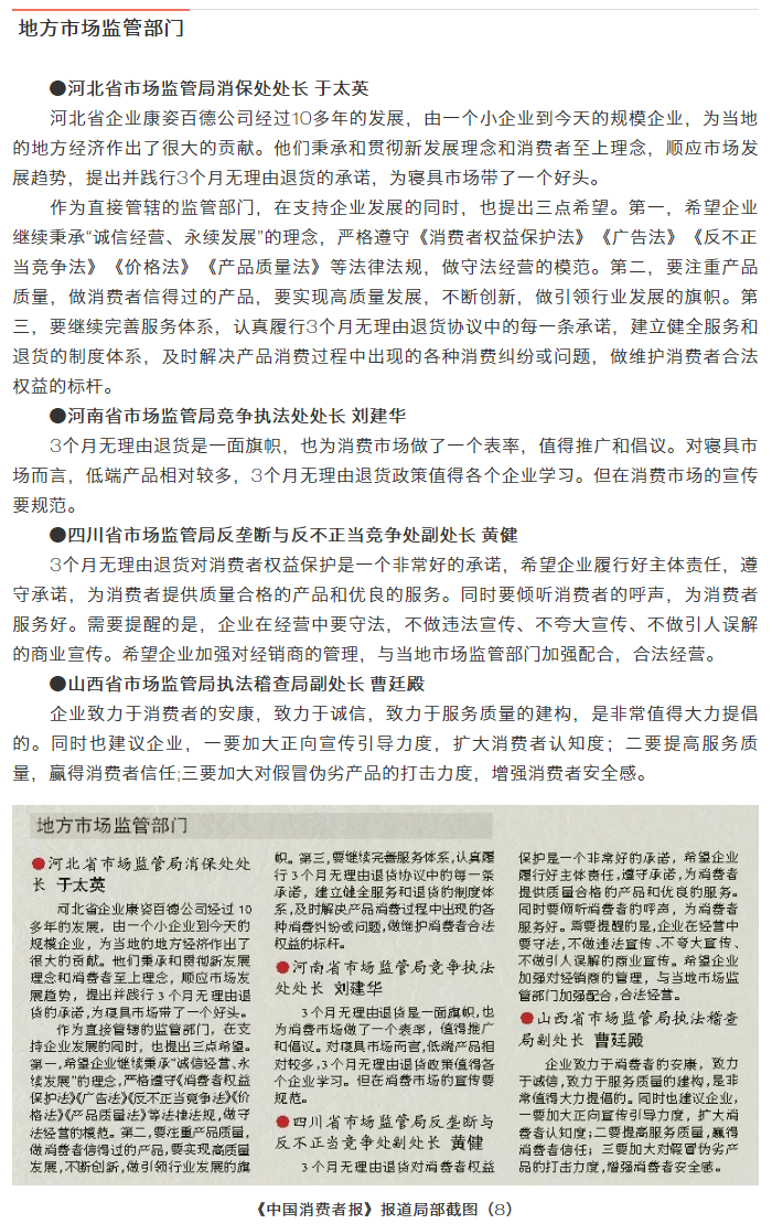 中國消費者報訊 為構(gòu)建良好的消費環(huán)境,規(guī)范寢具市場秩序,推動寢具行業(yè)自律和健康發(fā)展,由中國消費者報社主辦、康姿百德集團有限公司協(xié)辦的“寢具市場秩序與消費者權(quán)益保護”座談會于2019年5月28日在北京召開,來自國家市場監(jiān)督管理總局相關(guān)司局、中國企業(yè)家協(xié)會的相關(guān)領(lǐng)導、專家及寢具知名企業(yè)代表,圍繞消費者權(quán)益保護、促進寢具市場良性競爭與規(guī)范發(fā)展等話題進行了深入探討。本次座談會上,與會代表共同見證了康姿百德公司承諾“3個月無理由退貨”啟動儀式。
