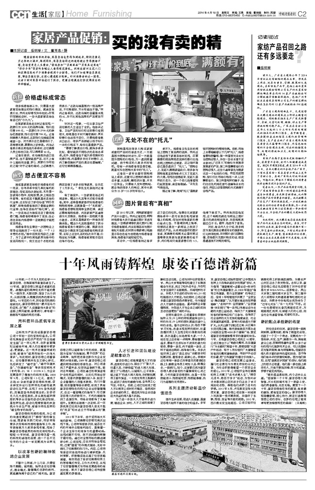在康姿百德公司成立10周年之際,《中國(guó)消費(fèi)者報(bào)》2014年4月18日C2版,用1/2的版面對(duì)康姿百德公司10年來(lái)的發(fā)展情況進(jìn)行了客觀系統(tǒng)的報(bào)道。