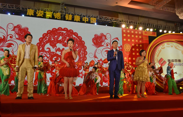 中午1時(shí)許,從全國各地趕來參加年會(huì)的經(jīng)銷商蜂擁而至。會(huì)場(chǎng)門前,由公司督導(dǎo)師組成的禮儀隊(duì),身著禮服,面帶微笑,列隊(duì)歡迎大家的到來,一句句“過年好”、“歡迎您回家”、“您辛苦了”的問候聲不絕于耳。會(huì)場(chǎng)內(nèi),由公司員工自己搭建的舞臺(tái)燈光閃爍,絢麗多彩,懸掛于舞臺(tái)兩側(cè)的大紅燈籠顯得格外耀眼;舞臺(tái)背景的LED屏幕上,“康姿百德、健康中國”、“康姿百德2013-2014年會(huì)”等字幕交替顯示;偌大的大廳內(nèi),40張餐桌上擺滿了水果、瓜子、花生、飲料……。大家邊吃邊聊,噓寒問暖,徜徉在幸福和愉悅之中,盡情享受著家一般的親切和溫暖。