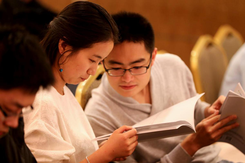 認(rèn)真觀看康姿百德公司資料的北大學(xué)子。