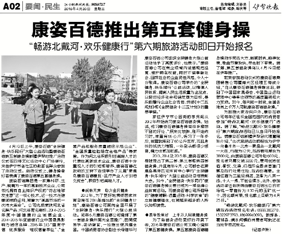2016年4月初,康姿百德“全民健身·快樂同行”大型公益活動(dòng)暨康姿百德第五套健身操啟動(dòng)儀式相繼在北戴河、南昌舉行,此次新疆站是健身操啟動(dòng)儀式的第三站?!兑晾缛?qǐng)?bào)》、《伊犁晚報(bào)》等媒體對(duì)此次活動(dòng)進(jìn)行了報(bào)道。