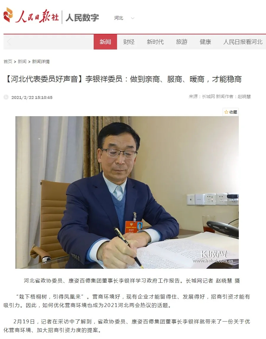 在河北省兩會(huì)政協(xié)委員駐地,李銀祥委員接受了河北經(jīng)濟(jì)日報(bào)的專訪。在受訪的過程中,李銀祥董事長針對2021河北兩會(huì)如何優(yōu)化營商環(huán)境的熱議話題,簡述了關(guān)于優(yōu)化營商環(huán)境、加大招商引資力度的提案。李銀祥董事長的提案還被刊登在了2021年2月21日的河北經(jīng)濟(jì)日報(bào)上。