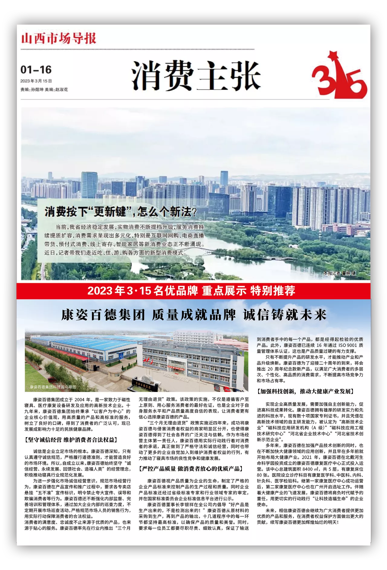 3·15消費(fèi)者權(quán)益日,康姿百德又一次憑借在誠(chéng)信經(jīng)營(yíng)和維護(hù)消費(fèi)者合法權(quán)益方面做出的突出貢獻(xiàn),受到了中國(guó)消費(fèi)者報(bào)、市場(chǎng)監(jiān)督管理雜志、河北經(jīng)濟(jì)日?qǐng)?bào)、山西市場(chǎng)導(dǎo)報(bào)、遼寧電視臺(tái)等多家權(quán)威媒體全方位、多視角的爭(zhēng)相報(bào)道。