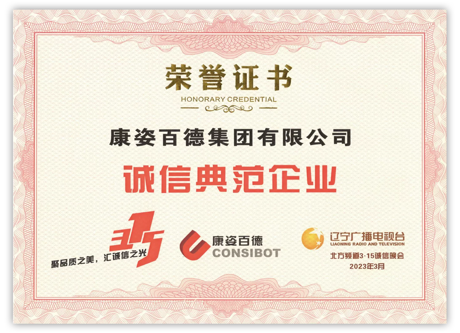 康姿百德榮獲“誠(chéng)信典范企業(yè)”榮譽(yù)稱號(hào)