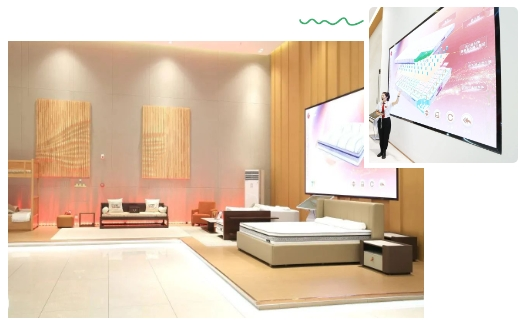 科技展廳安裝了智慧互動屏設(shè)備,上下兩個屏幕聯(lián)動,小屏控制大屏。用手操作觸控一體機(jī),可放大至穿透產(chǎn)品,實現(xiàn)康姿百德床墊的360°模型展示。全新的互動展示效果,讓參觀人員可以更直觀地了解康姿百德床墊的結(jié)構(gòu)。