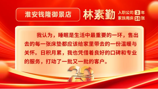 作為康姿百德專賣店的店員,林素勤常常掛在嘴邊的一句話就是“在崗一分鐘,敬業(yè)60秒”。每一分、每一秒都要創(chuàng)造價值。她的這份敬業(yè)不僅表現(xiàn)在不溜崗、不空崗,不忙的時候她還會花心思布置展區(qū)、學(xué)習(xí)產(chǎn)品知識,以最充足的準(zhǔn)備迎接客戶。她一直認(rèn)為,成交不是銷售的終止,在征集客戶同意的前提下,她會做不定期的售后追蹤,及時解決客戶在使用中遇到的問題,并給予正確指導(dǎo)。她認(rèn)為,睡眠是生活中最重要的一環(huán),售出去的每一張床墊都應(yīng)該給家里帶去的一份溫暖與關(guān)懷。日積月累,林素勤用她良好的口碑和專業(yè)的服務(wù),打動了一批又一批的客戶。