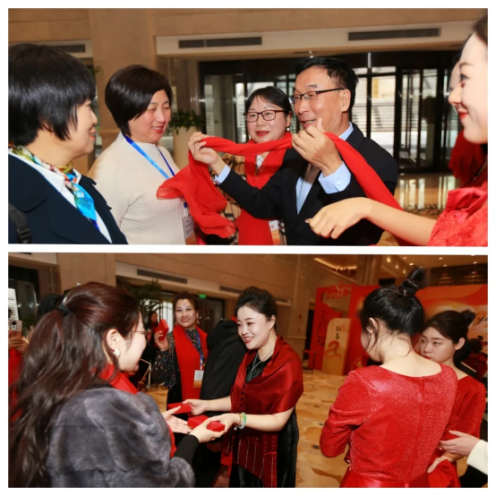 年會(huì)伊始,一條鮮紅的星光大道從會(huì)場(chǎng)入口延伸至主舞臺(tái)。全體參會(huì)家人身著正裝,神采奕奕踏上紅毯,在攝影鏡頭的聚焦下展現(xiàn)自信風(fēng)采。董事長(zhǎng)李銀祥攜管理層團(tuán)隊(duì)親自迎接,為每一位家人佩戴象征“鴻運(yùn)當(dāng)頭”的定制紅絲巾。簽名墻上,密密麻麻的名字不僅記錄著2024年的奮斗足跡,更寫(xiě)滿(mǎn)對(duì)2025年的熱切期待。