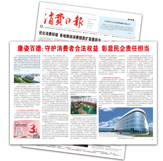 《消費(fèi)日?qǐng)?bào)》于1985年創(chuàng)刊,由國務(wù)院國有資產(chǎn)監(jiān)督管理委員會(huì)舉辦,中國輕工業(yè)聯(lián)合會(huì)主管主辦??底税俚路e極響應(yīng)國家號(hào)召,主動(dòng)維護(hù)消費(fèi)者合法權(quán)益,僅2024年,消費(fèi)日?qǐng)?bào)就2次對(duì)康姿百德進(jìn)行了專版報(bào)道。